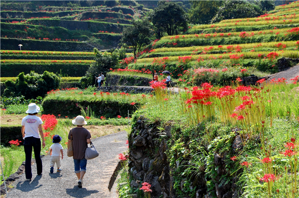 新川棚田群では9月中旬頃になると、約50万本の彼岸花が咲き乱れ、その景観を楽しめる「彼岸花めぐり&ばさら祭」には毎年市内外から多くの方が訪れます。